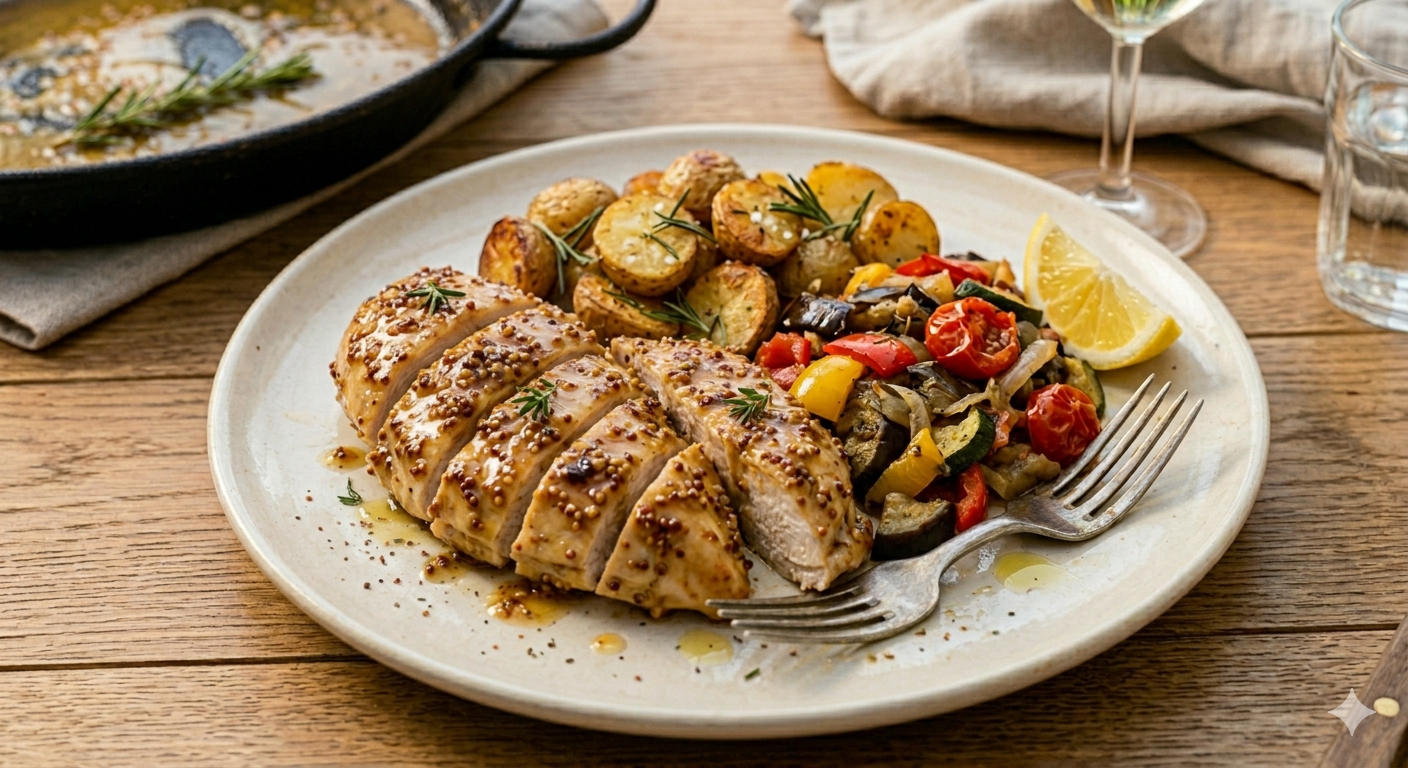 Honing mosterd kip met malse kipfilet uit de oven met huisgemaakte honing-mosterd saus, rozemarijn aardappeltjes uit de oven en rijkgevulde ratatouille